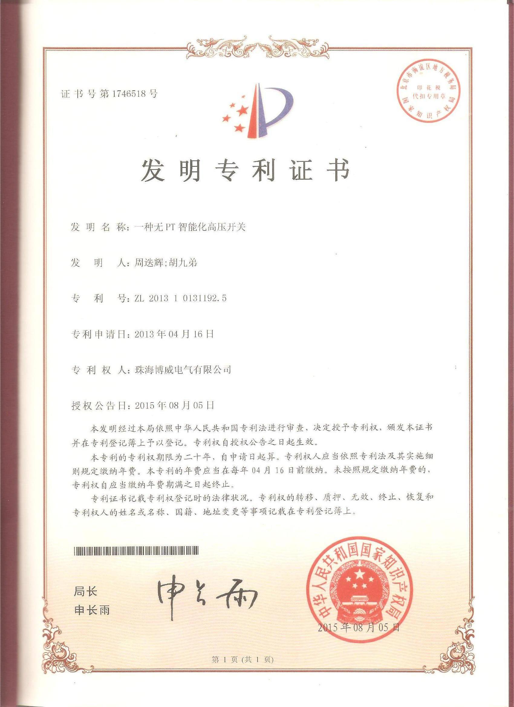 (發(fā)明)一種無PT智能化高壓開關(guān)