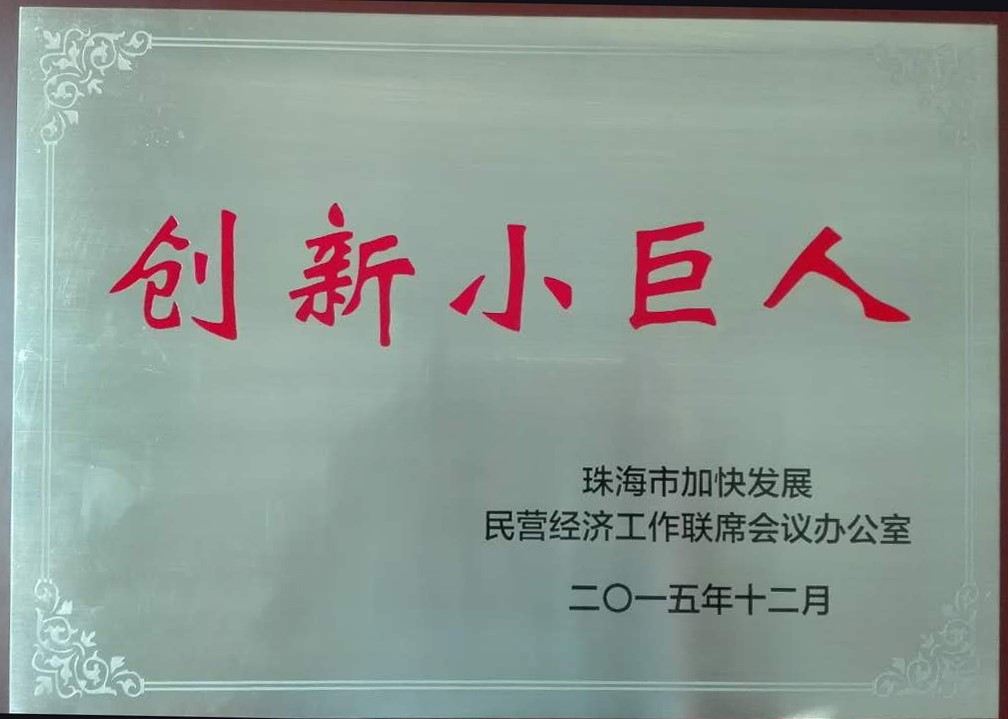 2016年7月29日,珠海市隆重召開了“珠海市民營經濟工作會議”,我公司作為珠海市重點民營企業,派代表參加了會議。會上對獲得“創新小巨人”稱號的企業進行了授牌儀式,我司被評為“創新小巨人”,上臺接受了由市委、市政府領導頒發的獎牌。