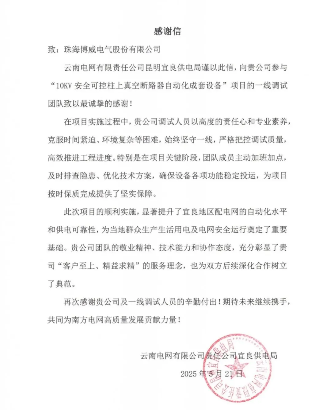 信中寫道:“貴公司調(diào)試人員以高度的責(zé)任心和專業(yè)素養(yǎng)克服時間緊迫、環(huán)境復(fù)雜等困難,始終堅(jiān)守一線,嚴(yán)格把控調(diào)試質(zhì)量,高效推進(jìn)工程進(jìn)度。此次項(xiàng)目的順利實(shí)施,顯著提升了宜良地區(qū)配電網(wǎng)的自動化水平和供電可靠性,為當(dāng)?shù)厝罕娚a(chǎn)生活用電及電網(wǎng)安全運(yùn)行奠定了重要基礎(chǔ)。”